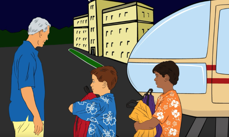 Vi är framme, killar! Här är platsen för vårt uppdrag.""Men, farfar Kai, det är ett sjukhus! Vad ska vi göra här?" "Sjukhuset har gett oss tillstånd att ge varje sjukt barn en ryggsäck med presenter vid sängen. Kom, så tar vi in ryggsäckarna."