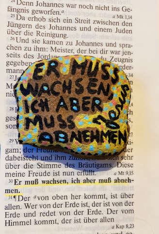 Har du redan funderat på vilken bibelvers du vill skriva på stenen? Kankse hittar du en som du gillar på bilderna eller när du läser Bibeln de närmaste dagarna. Du kan skriva bibelverserna på vilket språk som helst. På bilderna är de på tyska.