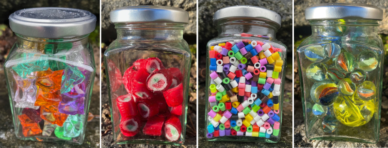 Presentglasburkar är ett enkelt och fint sätt att glädja någon. Gissar hur många sakar vi har fyllt i burkarna.