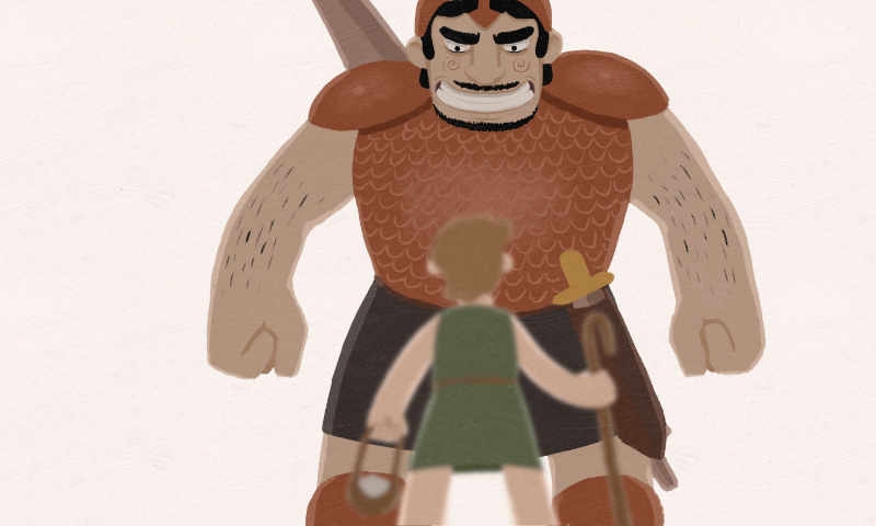 Goljat: “Hallå där, dumma israeliter! Fegisar! Hahaha! Jag ska göra fågelmat av er. Er Gud kan inte hjälpa er nu. Han är ingen match för mig.”